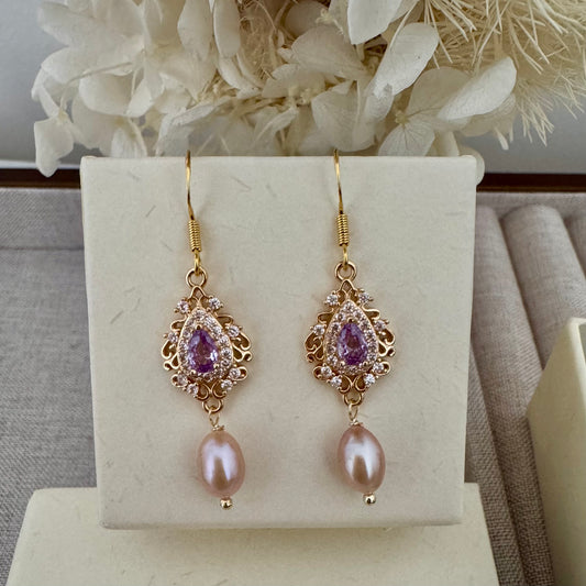 Amethyst & Purple Pearl Drop Earrings – Gold Wedding Jewelry