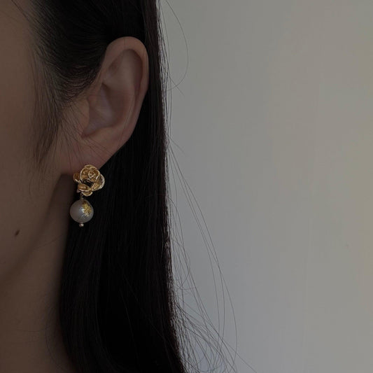 Gold Rose Stud Earrings with Natural Baroque Pearls – Elegant Handmade Jewellery